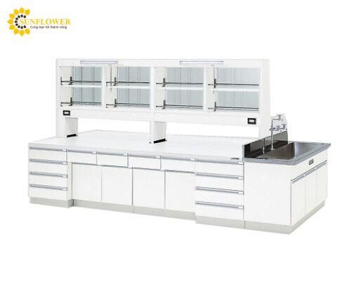 Kệ đựng thuốc thử: Ván dăm melamine hai mặt (Cửa kính, đèn huỳnh quang ống inox chống rơi)
