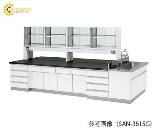 Bồn rửa SAN-3615 G kích thước 1500x3600x800/1800mm, trọng lượng 390kg. Mặt Cellon, cạnh PP, thân ván melamine, ngăn kéo và chậu thép không gỉ. Bồn có vòi hóa chất 3 cổng, phù hợp cho nhu cầu thí nghiệm và nghiên cứu.