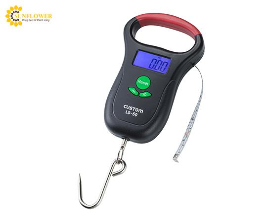 Mô tả sản phẩm LS-50 với trọng lượng 50kg, hiển thị tối thiểu 0,05kg và chức năng giữ dữ liệu. Thiết kế nhỏ gọn với đèn nền, pin AAA x 2 cái đi kèm. Kích thước 90 x 30 x 147mm, trọng lượng 166g, chống thấm nước IPX4, thích hợp cho nhiều mục đích sử dụng.
