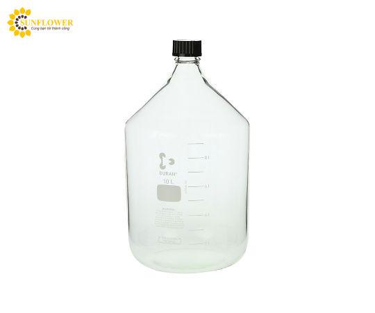 Chai thủy tinh mã số 017200-100002 với nắp đen, dung tích 10000 mL, đường kính trong φ30 mm, đường kính ngoài x cao φ227 x 410 mm theo tiêu chuẩn vít GL-45. Chai Duran có khả năng hấp trùng và nhiệt khô, nhưng cần tháo nắp hoặc nới lỏng trước khi sử dụng.