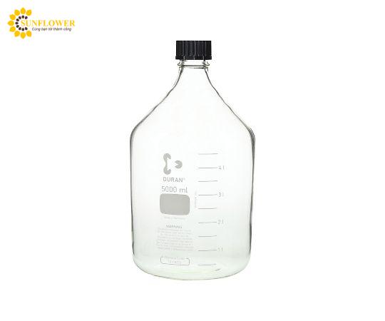 Chai thủy tinh mã số 017200-50002 có dung tích 5000 mL, đường kính trong φ 30 mm, đường kính ngoài x cao φ 182 x 330 mm. Được sản xuất theo tiêu chuẩn Vít GL-45 của Duran. Lưu ý khi hấp tiệt trùng cần tháo nắp hoặc nới lỏng vì nhiệt khô tiệt trùng có thể đục chai.