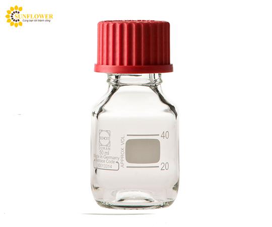 Chai thủy tinh mã số 017200-501 A với nắp màu đỏ, dung tích 50mL. Đường kính ngoài x cao: φ 46 x 87mm, đường kính trong φ 17mm. Tiêu chuẩn vít GL-32, chất liệu Duran. Phù hợp hấp tiệt trùng, nhiệt khô tiệt trùng, nhưng cần tháo nắp trước khi sử dụng.