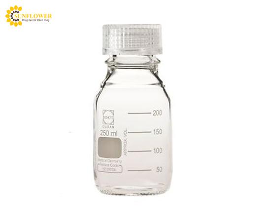Chai thủy tinh Duran mã số 017200-2503 A với nắp trong suốt, dung tích 250mL, đường kính φ30mm, tiêu chuẩn Vít GL-45. Sản phẩm chịu nhiệt khô tiệt trùng, an toàn khi tháo nắp hoặc nới lỏng. Kích thước φ70 x 138mm, phù hợp cho việc hấp tiệt trùng và đục chai thủy tinh.