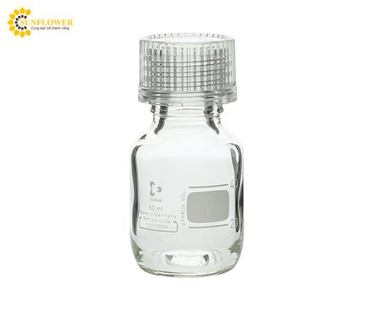 Chai thủy tinh mã số 017200-503 A với nắp trong suốt, dung tích 50mL và đường kính ngoài φ 46 x 87 mm. Được sản xuất theo tiêu chuẩn vít GL-32 của Duran. Thích hợp cho hấp tiệt trùng, tiệt trùng khô và có thể đục chai thủy tinh.
