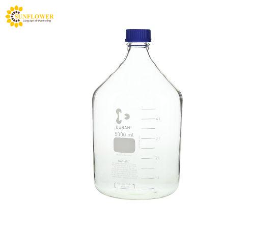 Chai thủy tinh Duran mã số 017200-5000 dung tích 5000mL, nắp xanh lam, tiêu chuẩn vít GL-45. Kích thước φ182 x 330mm, đường kính trong φ30mm. Thích hợp cho hấp tiệt trùng, vệ sinh dễ dàng với khả năng đục chai khi nhiệt khô tiệt trùng.