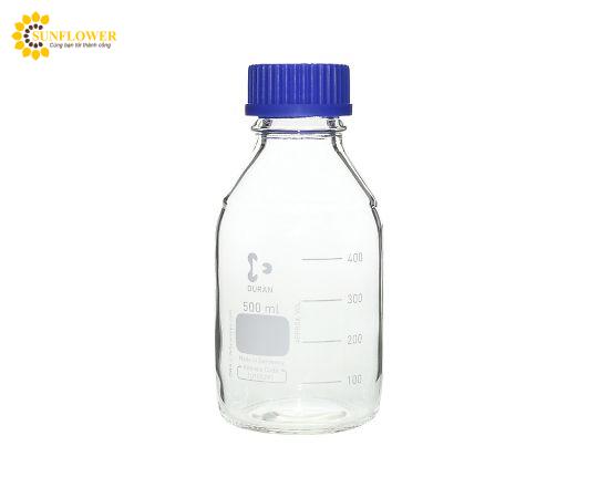Chai thủy tinh mã số 017200-500A với nắp màu xanh lam, dung tích 500mL, đường kính ngoài x cao: φ 86 x 176mm, tiêu chuẩn vít GL-45. Chai Duran chịu nhiệt, có thể hấp tiệt trùng và tiệt trùng khô. Lưu ý tháo nắp khi sử dụng để tránh đục chai.