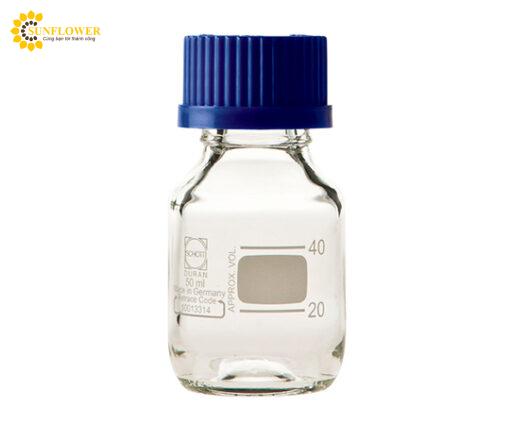 Chai thủy tinh mã số 017200-50 A, nắp xanh lam, dung tích 50mL. Với đường kính 17mm và kích thước φ 46 x 87 mm, tiêu chuẩn vít GL-32 của Duran. Sản phẩm đáp ứng nhu cầu tiệt trùng bằng cách tháo nắp hoặc nới lỏng trước khi sử dụng, hạn chế rủi ro chai bị đục trong quá trình tiệt trùng nhiệt khô.