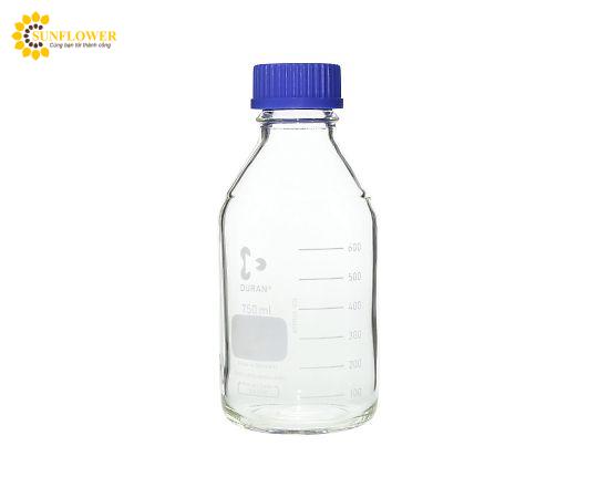 Chai thủy tinh mã số 017200-750 A với nắp màu xanh lam, dung tích 750 mL và đường kính ngoài φ 95 x 203 mm. Chai tiêu chuẩn GL-45 Duran phù hợp cho hấp tiệt trùng và nhiệt khô tiệt trùng, có thể tháo nắp hoặc nới lỏng để tránh rủi ro khi sử dụng.