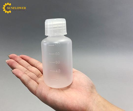 Sản phẩm hẹp miệng với công suất 100mL, chất liệu PP chịu nhiệt độ 130℃. Kích thước A: 100mm, B: 20mm, C: 76mm, D: 47mm, E: 16mm, F: 33mm. Được kiểm tra rò rỉ nước và khử trùng ở 121℃ bằng hơi nước. Kích thước gói hàng: 45 × 45 × 100mm, trọng lượng 20g.