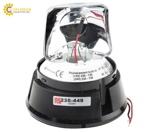 Đèn xoay 12V/24V dc với hiệu ứng ánh sáng độc đáo. Kiểu lắp gắn trên bề mặt, sử dụng loại bóng đèn sợi đốt. Thích hợp cho nhiều môi trường khác nhau. Thiết kế màu đen sang trọng, mã số 235-449, đường kính cơ sở 153mm, IP56, dòng V10994.