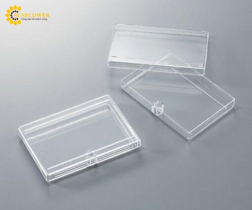 Hộp 500 cái kích thước 50 x 75 x 10 mm làm từ chất liệu PS, tiệt trùng bằng tia gamma. Sản phẩm được thiết kế chất lượng, tiện dụng để bảo quản và vận chuyển các mẫu trong phòng thí nghiệm, y tế hoặc nghiên cứu khoa học.