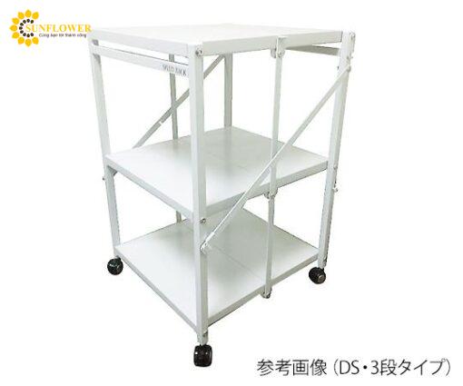 Sản phẩm là kệ gấp không cần dụng cụ, dễ vận chuyển và lắp đặt. Có thể cài đặt tốc độ và gấp nhanh chóng, khi gấp lại độ sâu giảm gấp 1/6. Kệ có 4 tầng, chất liệu thép sơn phủ epoxy melami, kích thước 962 x 300 x 998 mm, trọng lượng 17 kg.