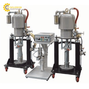 It performs automatic mixing, quantity dispensing operation of high viscosity two liquid type materials using high pressure transfer pump of pressure transferring ratio of 60:1