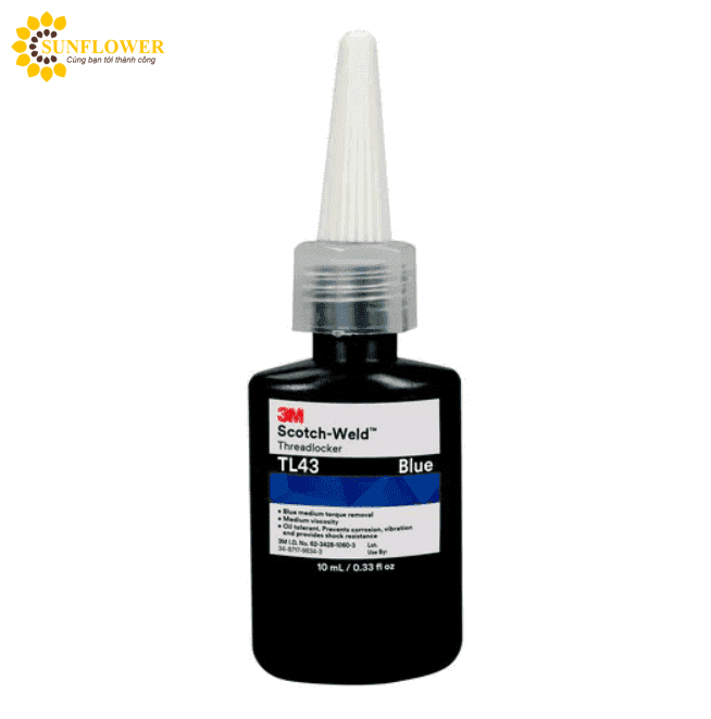 Keo khóa ren 3M Scotch-Weld TL43 là loại đa năng, có thể tháo rời bằng các dụng cụ cầm tay, có độ kết dính bền trung bình cho hầu hết các loại vít, đai ốc và bu lông. Nó có khả năng chịu được dầu để giúp bảo vệ các bu lông và đặc tính thixotropic giúp ngăn chặn keo chảy, nhỏ giọt hoặc di chuyển khi tra