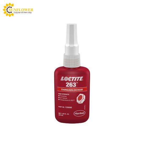 Loctite 263 là loại keo khóa ren sử dụng trong nhiều ứng dụng, với độ kết dính thông thường và phù hợp với hầu hết mọi loại bộ phận bằng kim loại. Loại keo khóa ren này giúp bảo vệ, làm đầy và xiết chặt các loại ri-vê, đai ốc, đinh vít, và các loại ốc có phần ren bên dưới khỏi sự tác động của rung lắc và va đập làm lỏng lẻo các mối liên kết. Loctite 263 hoạt động trên hầu hết các bề mặt kim loại, bao gồm cả các bề mặt thụ động như thép không gỉ, nhôm và bề mặt đĩa. Keo chống chịu tốt với nhiều loại hóa chất như dầu nhớt công nghiệp, dầu máy, ăn mòn bề mặt, …