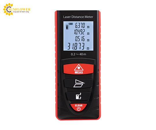 Mô tả sản phẩm: Thước đo laser với phạm vi đo lường từ 0,2 đến 40m và độ chính xác ± 2.0 + 0.05mm/m. Thiết kế nhỏ gọn kích thước 49 x 28 x 120mm, trọng lượng 120g. Cung cấp chức năng đo liên tục, tính diện tích và chiều cao. Hiển thị dữ liệu mới nhất cùng 3 lần đo gần đây nhất. Sử dụng pin AAA