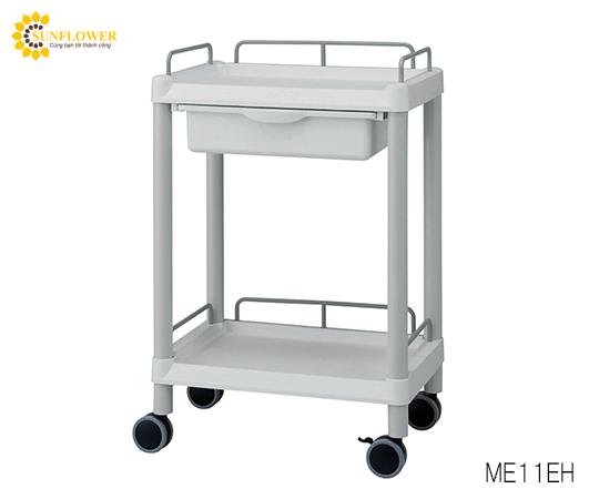 Mô tả sản phẩm ME11EH với ngăn kéo, 2 tầng, kích thước 532 x 368 x 819mm và trọng lượng 6kg. Chất liệu chính là khay nướng và ván kệ PP, thanh chống nhựa ABS, với kích thước ván kệ 320 x 440mm và bánh xe φ75mm đàn hồi. Thiết kế tiện ích và chất lượng cao.