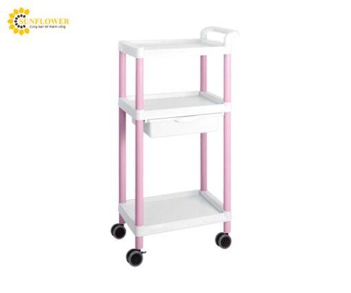 Xe đẩy ME31B màu hồng 3 tầng, trọng lượng nhẹ, lắp ráp dễ dàng. Thiết kế chắc chắn từ nhựa, có ngăn kéo và khung bảo vệ. Các tấm/kệ trên cùng được đóng khung ngăn vật dụng rơi. Sản phẩm tiện lợi cho việc di chuyển và sắp xếp đồ đạc.