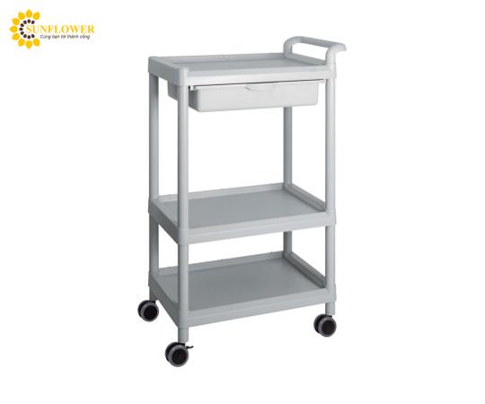 Xe đẩy ME32D màu xám với thiết kế đơn giản, trọng lượng nhẹ và dễ lắp ráp. Được làm từ nhựa chắc chắn, xe có 3 tầng kệ và ngăn kéo, giúp ngăn chặn vật dụng rơi xuống. Khung bảo vệ giúp bảo vệ và duy trì độ bền cho xe.